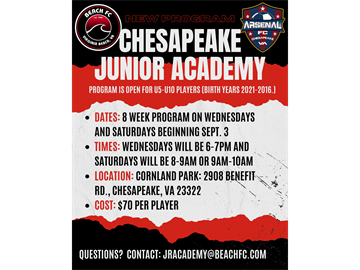 We are excited to launch our Chesapeake Junior Academy and entering a new phase for our club by working with a trusted development partner with Beach FC. We strive to continue to evolve as a club and improve our players, services and programs.